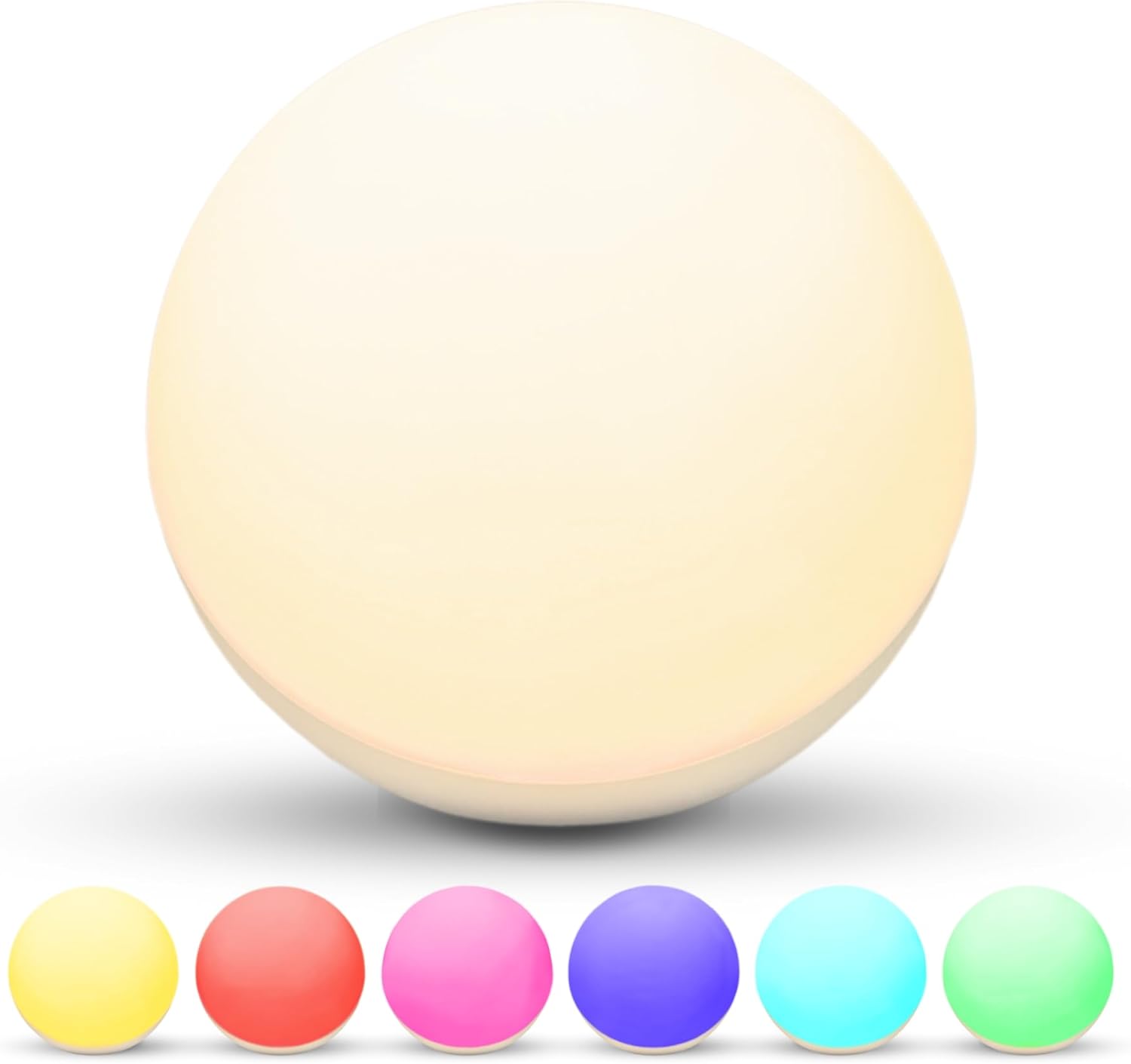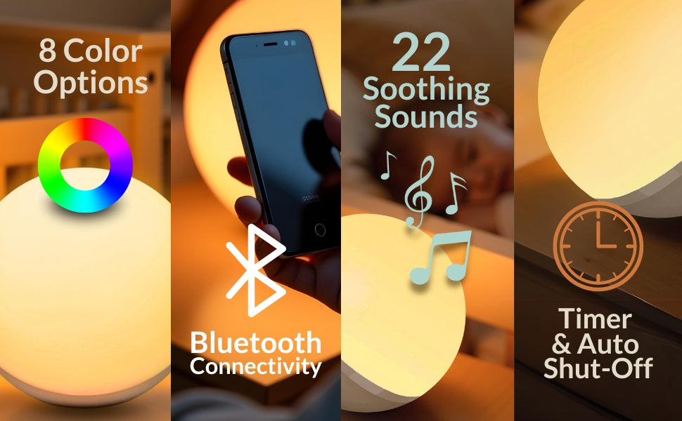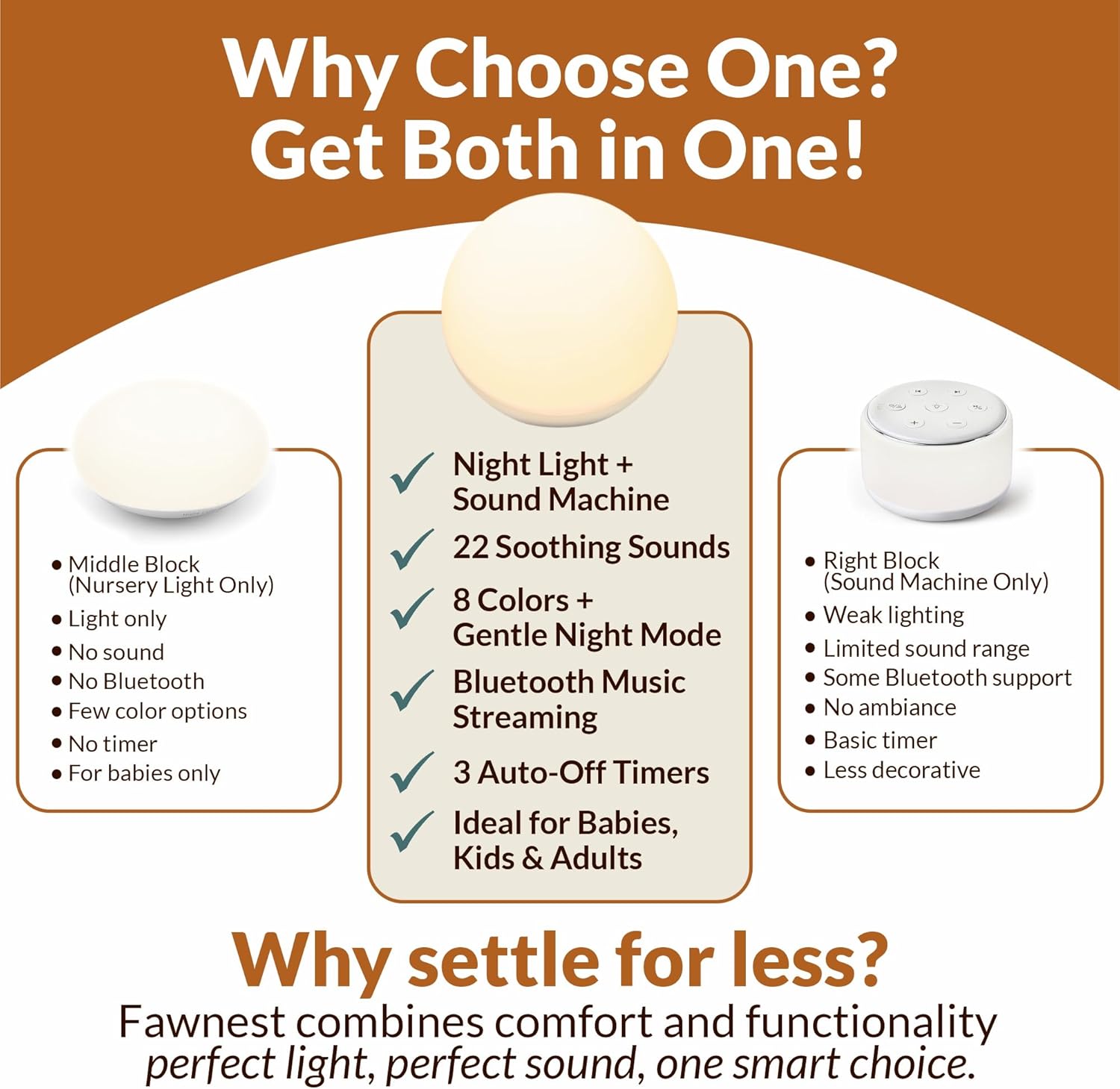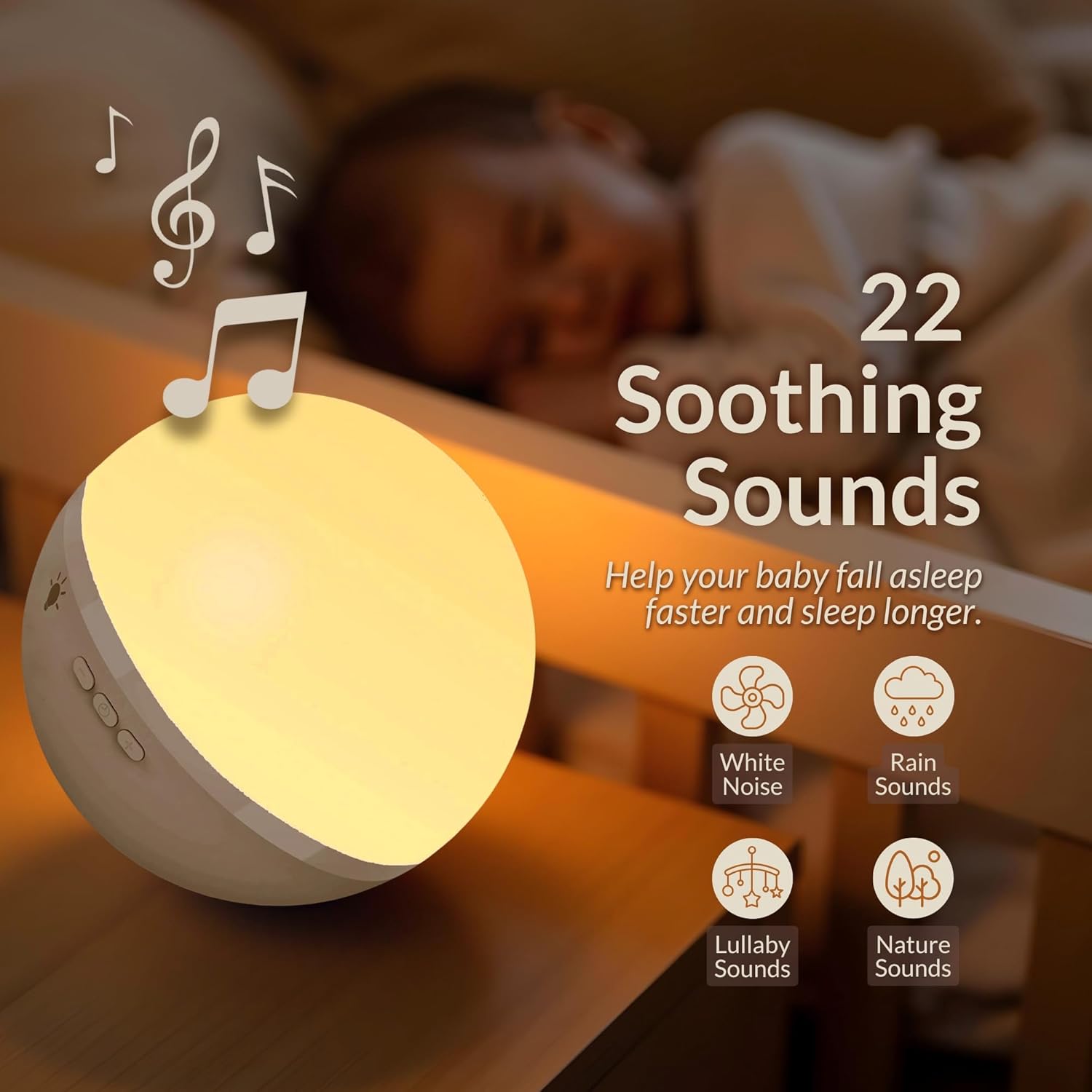 Baby Night Light Sound Machine – White Noise, Sleep Sounds, Egg Light for Nursery and Kids, with Wireless BT and Soothing Sounds by FAWNESTThis nightlight/sound machine is nifty. There are many light colors available and lots of different sounds. There are timers and everything fits into a round device that's about five inches across.